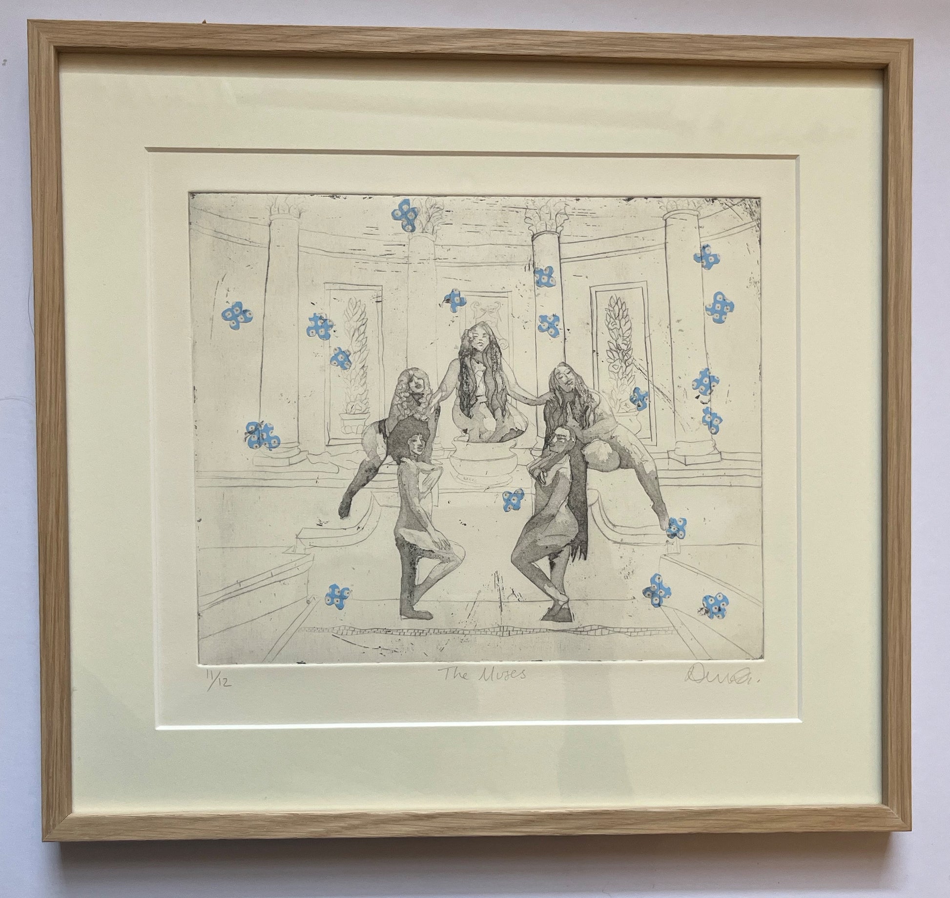Blue frame is bespoke hand-painted wooden frame with UV 70% anti reflective glass.